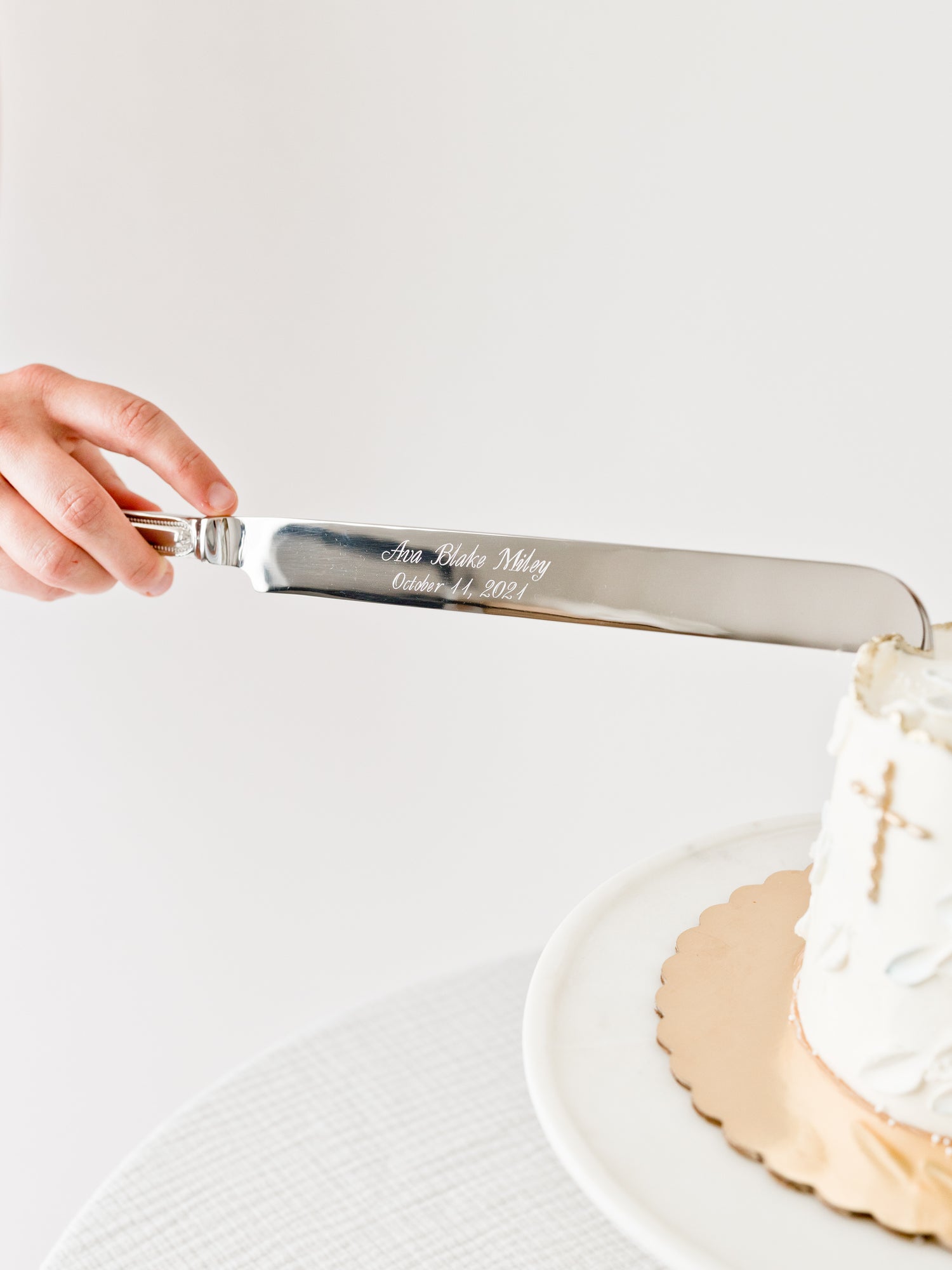 We offer in-house engraving! Your name and date will be slightly off center on the blade. This is to protect the engraving over years of using the knife. Another plus to the off-center engraving is that the name and date show even when the knife is being used for cutting the cake.
